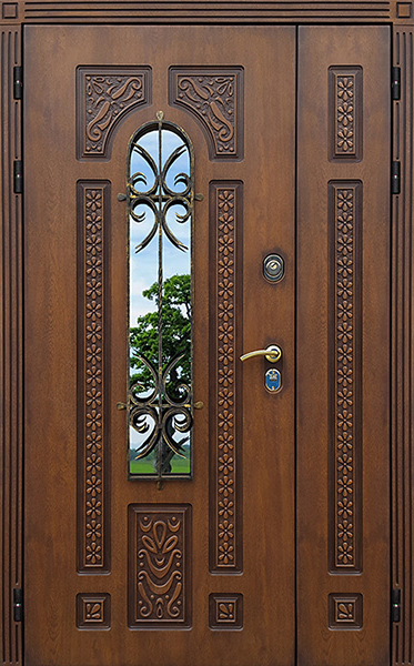 Двойная входная дверь с большим стеклом и ковкой для дома №25 сочетает в себе стиль и надежность, предлагая великолепное решение для вашего дома. Внешняя и внутренняя отделка выполнены из панелей МДФ с ПВХ, что придает двери долговечность и устойчивость к механическим повреждениям, а также способствует легкости ухода. Стеклопакет в комбинации с изысканным кованым узором создаёт не только эстетическое наслаждение, но и позволяет улучшить светопроникновение в помещении. Двойная входная дверь с большим стеклом и ковкой для дома №25 от производителя: быстрое изготовление и монтаж в Серпухове, индивидуальные размеры, широкий выбор материалов и фурнитуры, официальная гарантия до 10 лет.